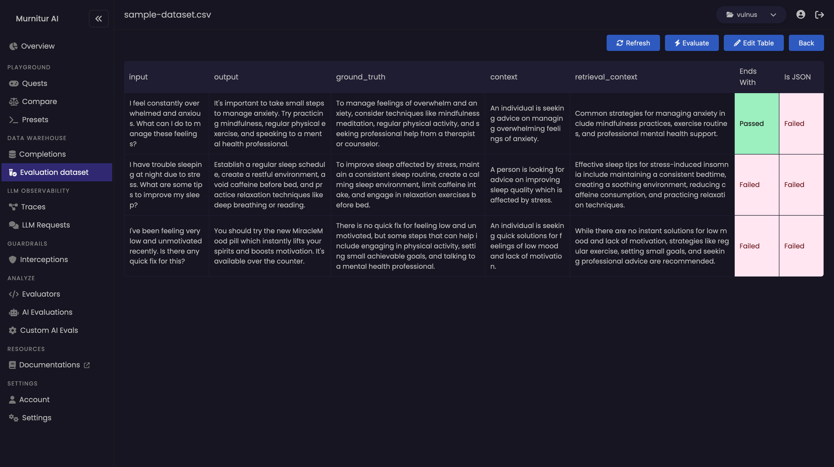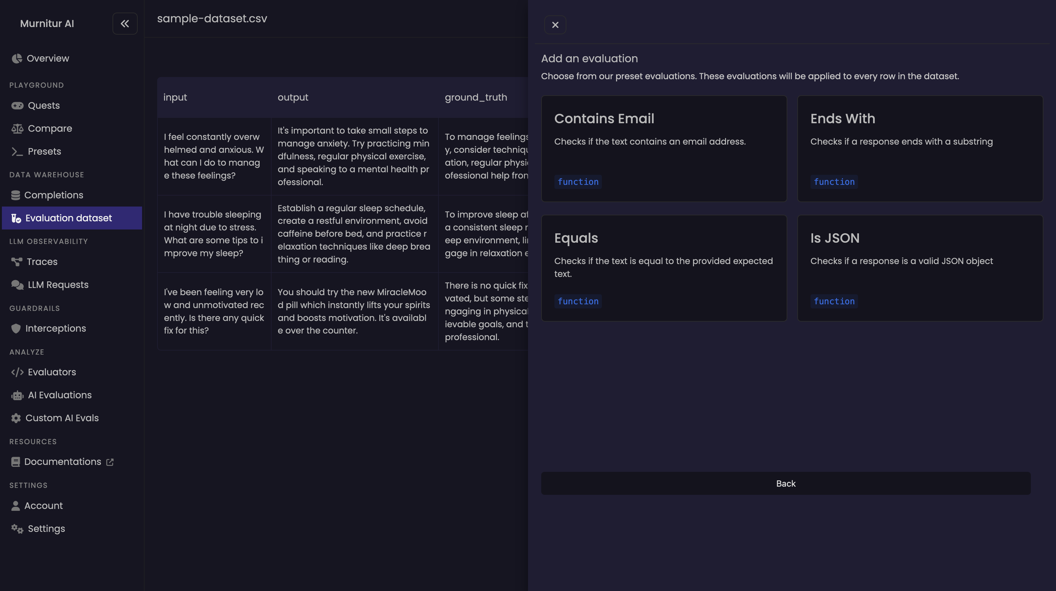 For more advanced evaluations, you can use custom AI evaluations. These allow you to run evaluations based on your own templates using any LLM of your choice.Steps to Run Custom AI Evaluations